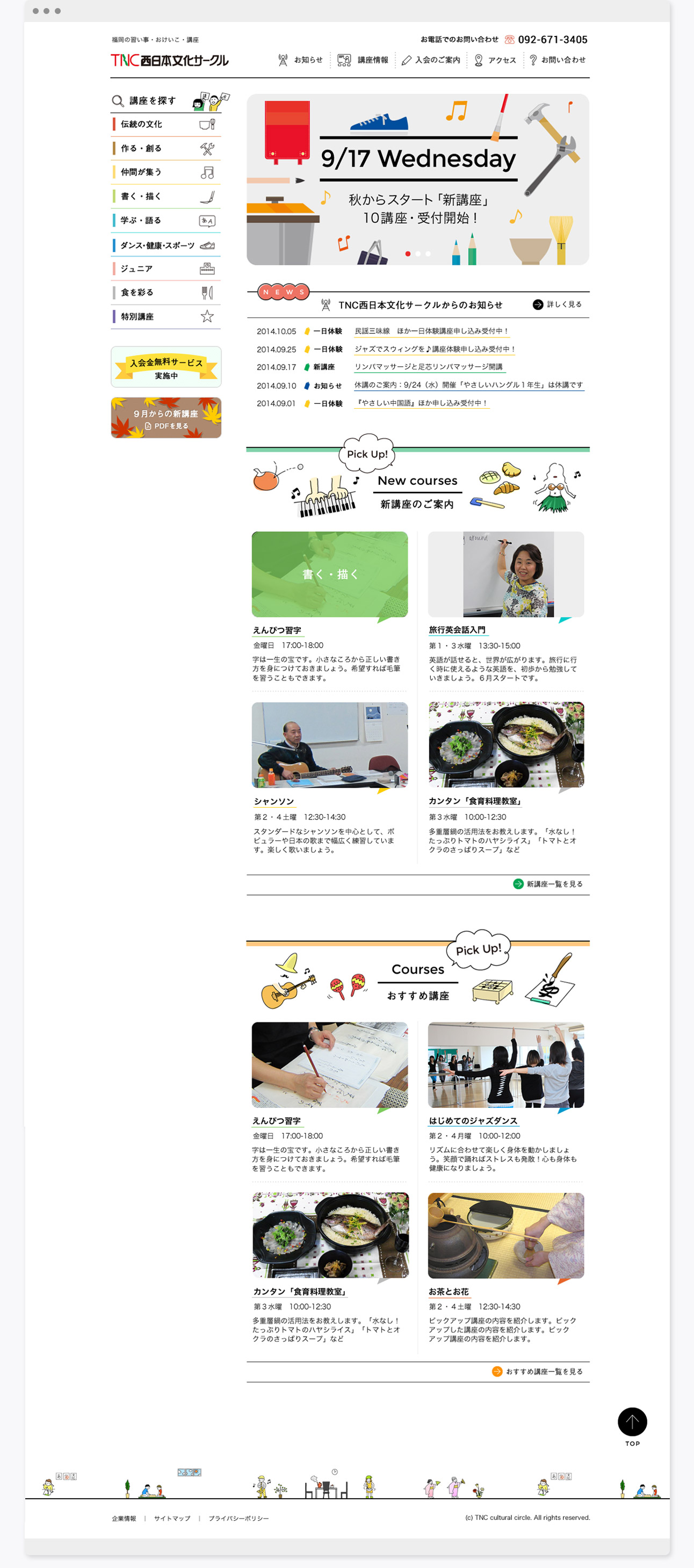 福岡のカルチャースクールのWebサイトリニューアルのデザインを担当した際、利用者が60歳以上のご年配が多かったため、見てわかりやすいようアイコンやイラストを全体的に多く取り入れた。