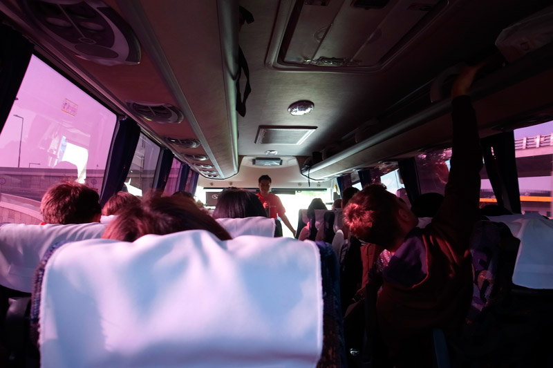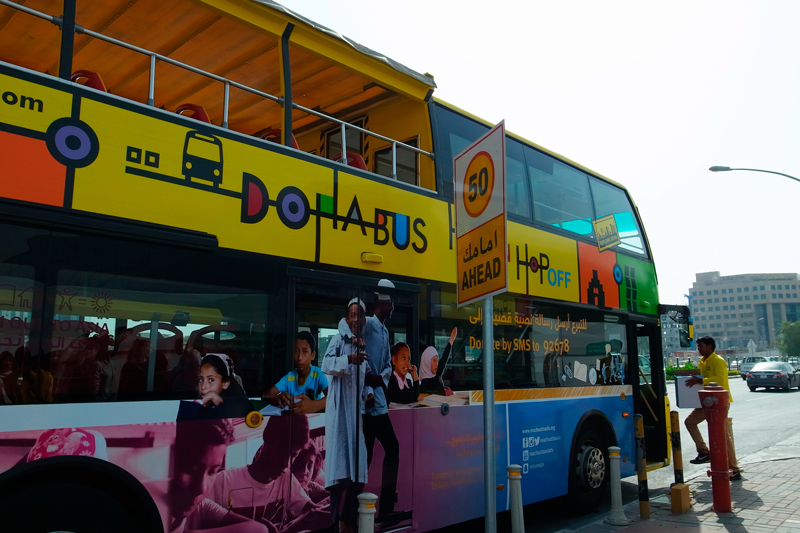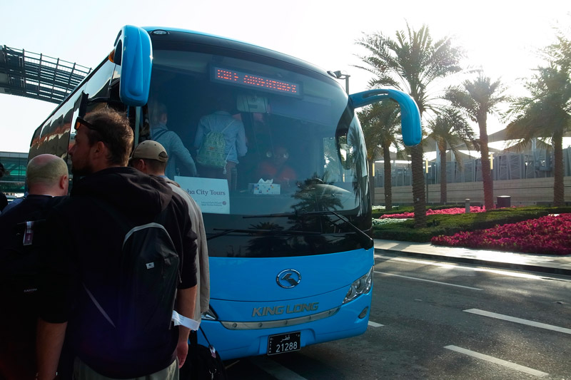カタールはとても暑く、日本の冬からやってくると気温差が半端ではありません。コートを脱いで半袖に着替えていてよかったと思っていたら、大型バスがやってきました。バスの中は窓に貼られたシートのせいでややピンク色です。ツアーは英語で行われ、ガイドさんの自己紹介やドーハについてのガイドを聞くことができます。