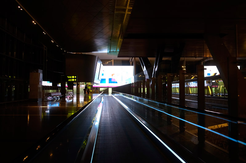 成田を夜出発し、当日ドーハのハマド国際空港に着いたのは朝5時ごろ。空港内は一部を除いてお店が閉まっており搭乗エリアは人影もまばらです。(実際はもう少し明るいのでご安心を!)メインエリアは昼と変わらず明るく、早朝なのに人通りも多いです。